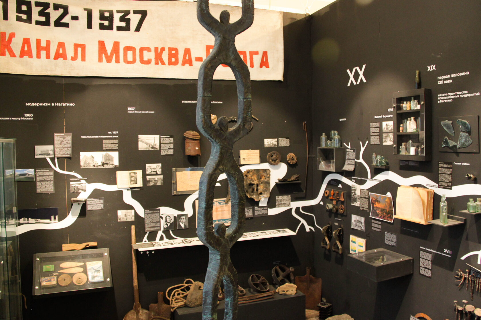 Кроме того, в музее прослеживаются судьбы творческих личностей, которые были связаны со строительством этих сооружений, таких как поэтесса Лада Могилянская, посвятившая стройке стихотворение «Перерва», писатели Николай Жигульский, режиссёр Игорь Терентьев, художники Глеб Кун, Василий Ёлкин, Константин Соболевский, Александр Марышев и многие другие. Ещё позже рядом через реку возвели мост для линии метро — это уже транспортные реки и потоки. Под ним бригада Мостотряда №4 выполнила спрямление русла самой реки. Большинство жилых массивов, природных и промышленных зон, о которых рассказывает экспозиция музея, тянется вдоль реки Москвы от Новоспасского монастыря до Капотни, а также вдоль малых рек, их притоков и оврагов (Коршуниха, Котловка, Даниловка, Жужа, Чура и другие). Этот огромный речной комплекс и его долины стали родиной районов вокруг Нагатино. Само название происходит от крестьянских ивовых настилов меж овощных грядок, а первые местные жители были не просто крестьянами, а царской обслугой.